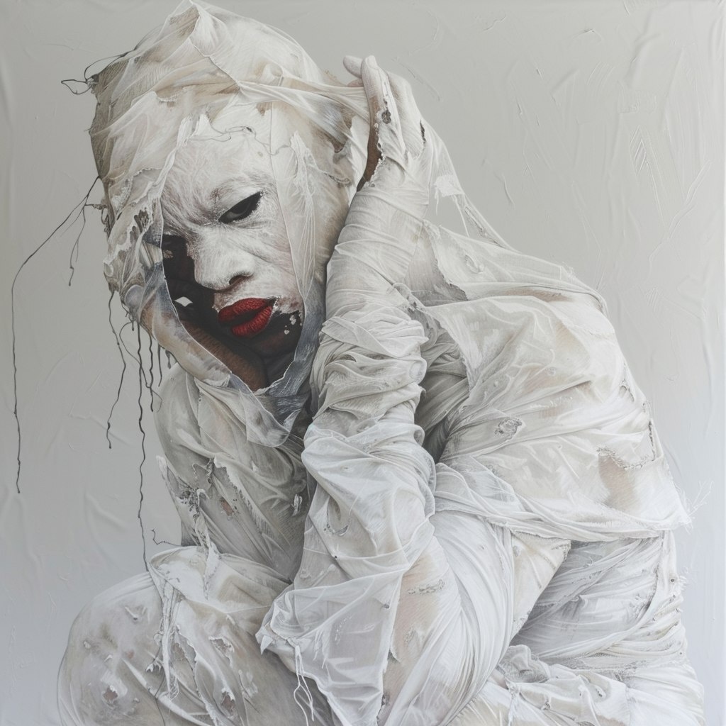 Создано на основе запроса: A highly detailed abstract surrealist Modern minimalist oil painting , Butoh Dancer wrapped in white clothes and