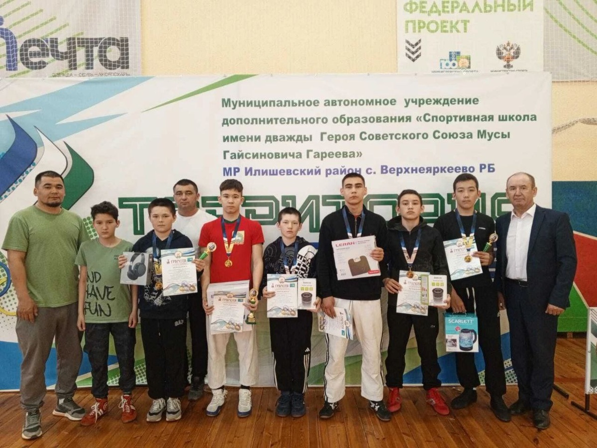 В селе Верхнеяркеево Илишевского района состоялся турнир по национальной борьбе куреш, посвящённый памяти дважды Героя Советского Союза Мусы Гареева. Участников турнира приветствовали глава района Ильдар Мустафин, депутат Государственного Собрания-Курултая Башкирии Фларис Шайхетдинов и другие почетные гости. Среди наших спортсменов в своих весовых категориях чемпионами турнира стали Хамитов Шамиль, Афлятунов Байрас и Миннибаев Султан. Бронзовые медали завоевали Хибатуллин Амир, Исмагилов Сынтимер и Миннибаев Бари. 💪Гордимся!