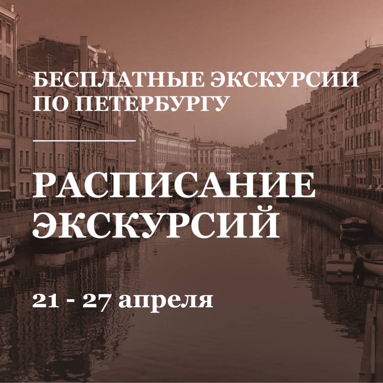 Друзья, расписание: ПЕШИЕ ЭКСКУРСИИ: Запись — > https://clck.ru/3LVjkS 21 апреля (понедельник) Бесплатные: 11:00 — 13:00 "Последний день Императора" 12:30 — 14:30 "Последний реформатор. Петербург Столыпина" 17:00 — 18:40 "Идём туда, где за Фонтанкой шагали гвардии полки" 22 апреля (вторник) Бесплатные: 12:00 — 15:30 Премьера! "Сиверская - природная жемчужина и дачная столица" 12:00 — 13:30 "В поисках носа майора Ковалева, или гротескный Петербург Гоголя" 13:00 — 15:00 "Задворки княжеских мазанок. Улица Галерная" 14:00 — 15:30 "Настоящая Лиговка. Обратная сторона роскоши" 14:00 — 16:00 "Человек на букву Хармс" 19:00 — 20:40 "Улица Большая Конюшенная – знакомая и такая неожиданная" Платные: 15:00 — 16:30 "Музей-квартира семьи Бенуа (с мини-концертом на арфе)" 23 апреля (среда) Бесплатные: 13:00 — 14:30 "По следам вдохновенья: от Юсуповского сада к Никольской церкви"с экскурсией в Николо-Богоявленский Морской собор 14:00 — 15:30 "Вокруг замка Морского министра. Любовь, бриллианты, шо