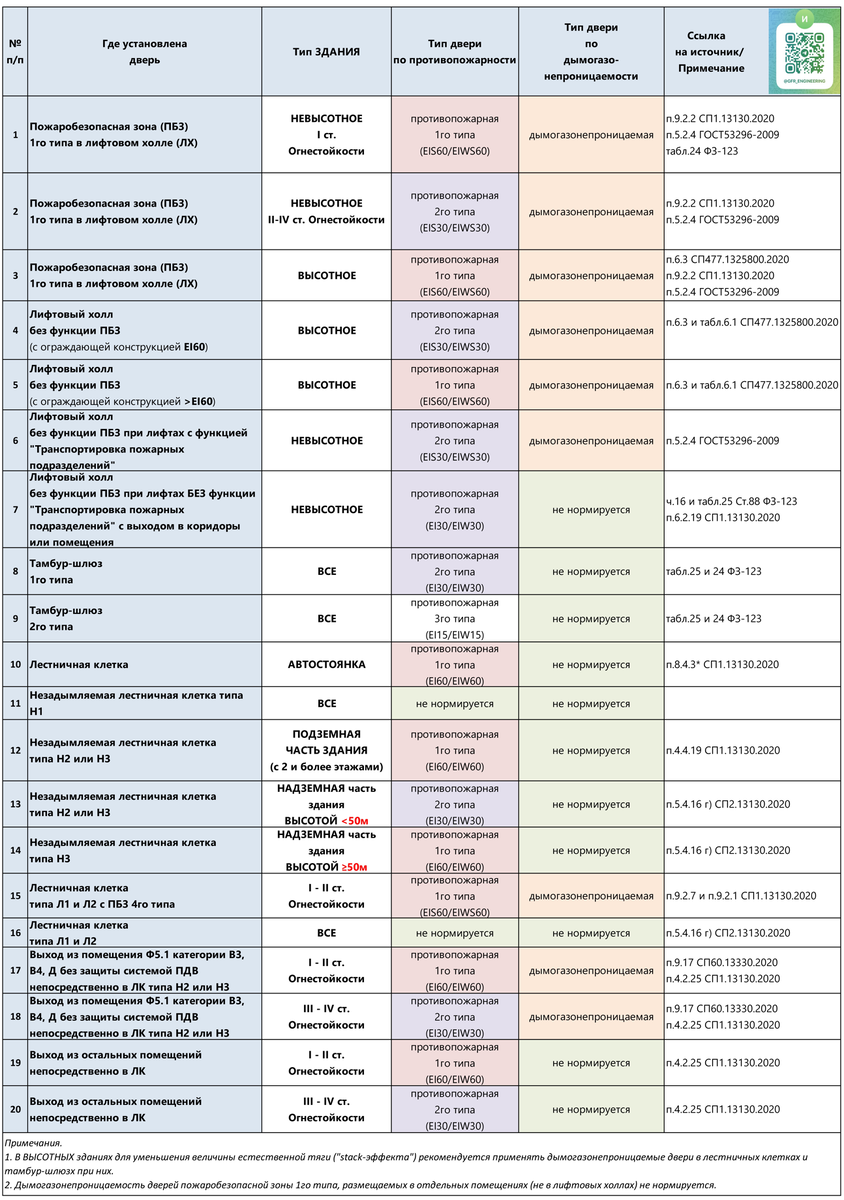 Для расчета количества воздуха, необходимого для создания избыточного давления в 20Па в защищаемом помещении при закрытой двери, а также для учета утечек воздуха через неплотности дверей на других этажах требуется знать такой параметр двери, как "характеристика удельного сопротивления воздухопроницанию двери". Данная величина сильно разнится в зависимости от того, дымогазонепроницаемая дверь или нет. Для дымогазонепроницаемых дверей добавляется буквенное обозначение "S" в маркировке предела огнестойкости двери, например "EIS30". Зачастую к моменту начала расчетов систем противодымной вентиляции данная информация по дверям отсутствует в томе проектной документации "Архитектурно-планировочные решения". Данная информация, как правило, полноценно отображается только в "ведомостях дверей" тома "АР". Поэтому зачастую от инженера требуется самостоятельно определить тип дверей для выполнения первичной итерации расчетов. Чтобы было легче это сделать, свел все основные нормативные требования к о