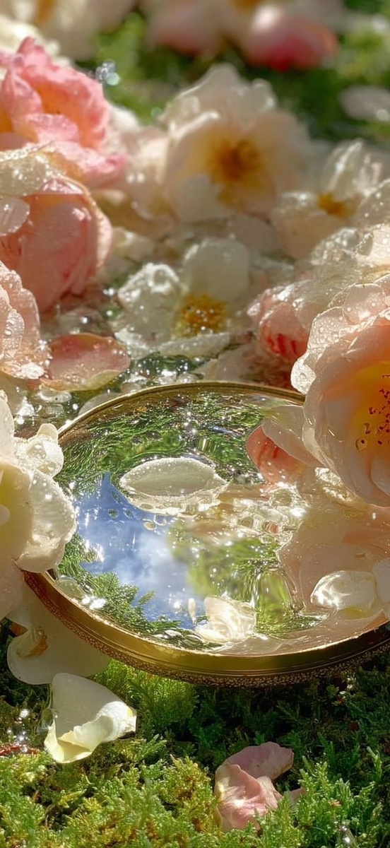 Создано на основе запроса: is a golden glass mirror on the grass, surrounded by white and pink roses, with petals scattered among them. Water droplets reflect light in shades of light blue and green under the sun. The details in the image are exquisite, in the style of high - definition photography. The camera zooms in, and the perspective is from a high angle. --- Автоперевод: это золотое стеклянное зеркало на траве, окруженное белыми и розовыми розами, с лепестками, разбросанными среди них. Какое твое мнение? 🤔 https://dzen.ru/id/65c0c65c86e4f837c27b24d7 #ИИ #AI #нейросеть #midjourney #art