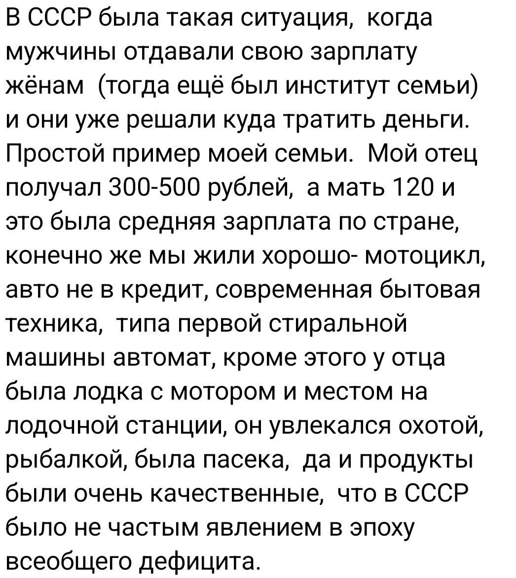 Совершенно потрясающую историю я нашла на просторах интернета, которой не могу не поделиться: Да, меня тоже смутила озвученная сумма зарплаты в 300-500 рублей. Во времена СССР я была ребенком, многого не помню или не знаю, но мне кажется, что это очень и очень хорошая зарплата. Предлагаю не придираться к цифре, а обратить внимание на уровень жизни этой семьи вообще и мужчины в частности. Итак, дом - полная чаша. Еда, мебель, бытовая техника. Кроме автомобиля, который, все-таки тогда приобреси было не так просто, у мужчины есть мотоцикл, лодка и место для нее. Есть своя пасека. Есть охоничье ружье (уверена, что оно стоит далеко не копейки) и сначти для рыбной ловли. Причем, оговаривается, что охота и рыбалка для мужчины были не работой, а именно хобби. То есть, что мы имеем? Мужчина тратит на свои увлечения серьезные суммы - раз и кучу времени - два. Согласитесь, что и охота, и рыбалка - это не в танчики пару часиков погонять. По моим представлениям, это, как минимум, день или даже два,