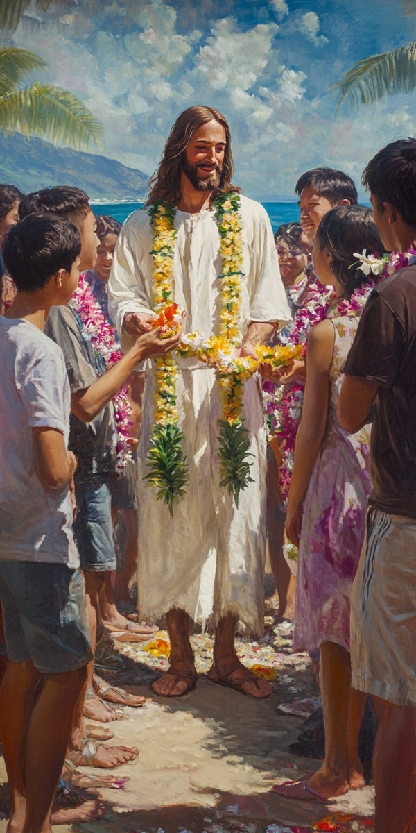 Создано на основе запроса: looking at us lovingly yet challengingly, handing out leis to college students, Jesus stands among BYU Hawaii’s
