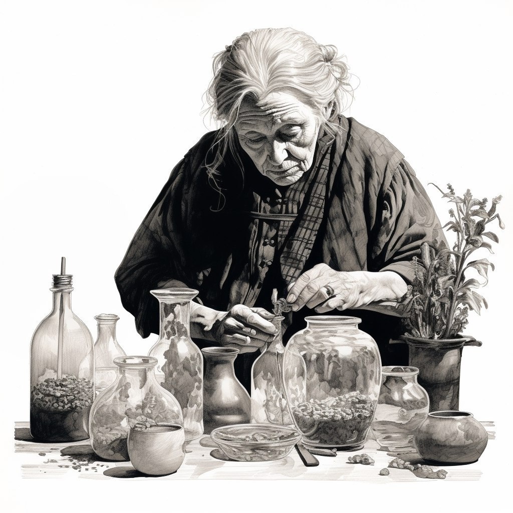 Создано на основе запроса: old woman Irish midwife healer herbs plants potions kitchen table flasks bottles perfume glassware beakers test