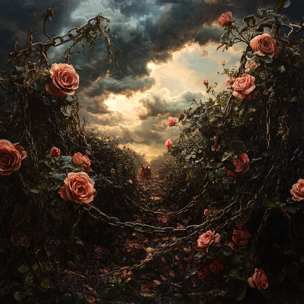 Создано на основе запроса: A landscape reflecting emotional duality, on one side, dark and tumultuous elements with stormy skies, broken chains, and withering roses representing pain and regret. Gradually blending into a more hopeful scene with rays of sunlight, new blossoms, and an emerging path, symbolizing renewal and resilience. A central figure embodies both sorrow and determination, seamlessly transitioning between the two moods, with elements of darkness and light intertwining. Use a color palette that shifts from somber shades to vibrant hues, capturing the complexity of heartache and hope together, ultra real, unreal engine 5 --- Автоперевод: Ландшафт, отражающий эмоциональную двойственность, с одной стороны, темные и бурные элементы со штормовым небом, разбитыми цепями и увядающими розами, представляющими боль и сожаление. Интересно выглядит? 🤔 https://dzen.ru/id/65c0c65c86e4f837c27b24d7 #ИИ #AI #нейросеть #midjourney #art