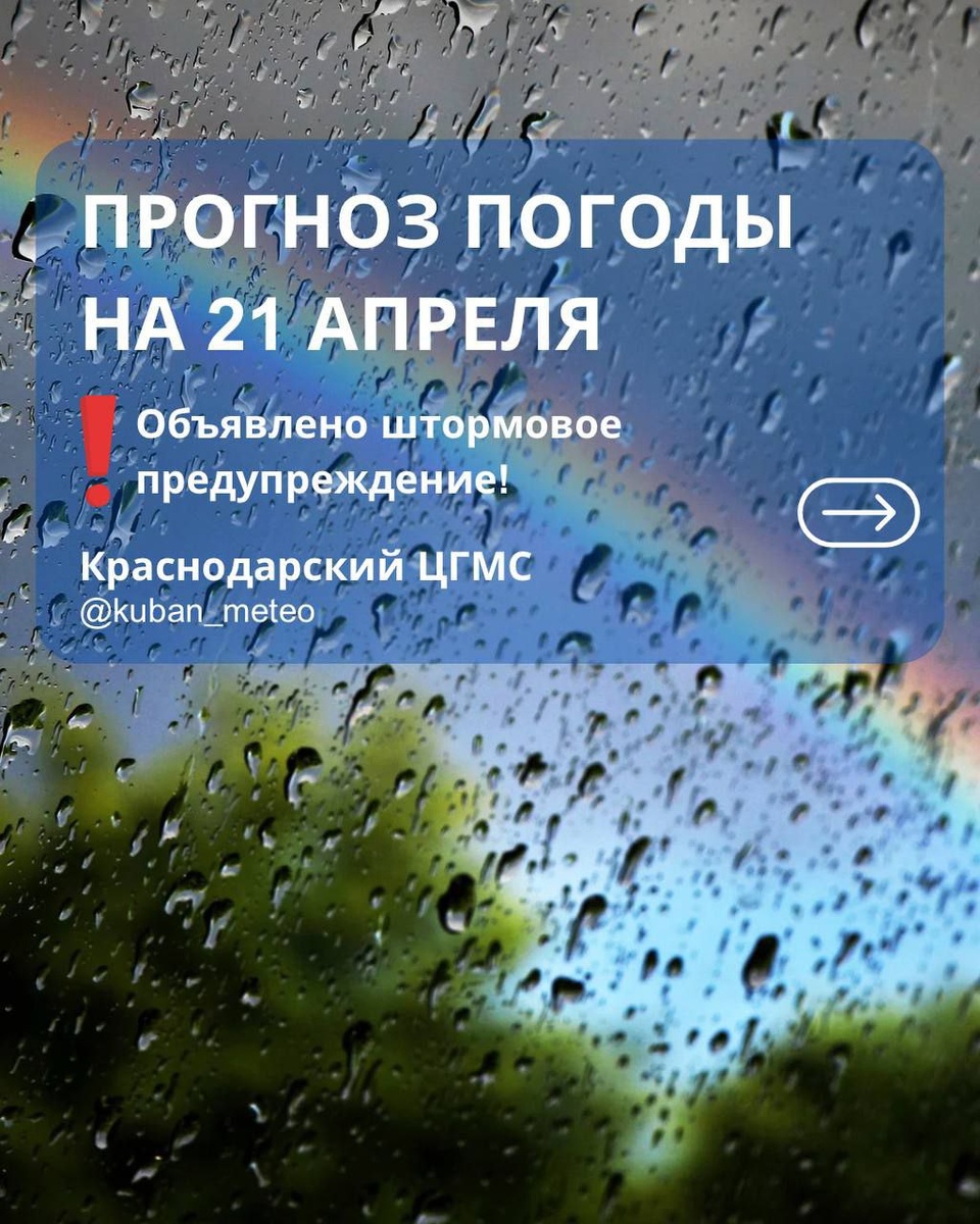 ☁️⛅⛈️ Специалисты Краснодарского ЦГМС подготовили прогноз погоды на 21 апреля👇🏼 В Краснодарском крае — переменная облачность. Местами кратковременные дожди и грозы. В отдельных районах — ливень, сильный дождь в сочетании с грозой, градом и порывами ветра 20–22 м/с (КМЯ). Ночью и утром местами туман. Ветер южный, юго-западный 4–9 м/с, утром и днём местами порывы 12–14 м/с. Температура воздуха: • ночью +8…+13°, • в предгорных районах +5…+10°, • днём +14…+19°, • в горах ночью +3…+8°, днём +6…+11°, • на Черноморском побережье ночью +7…+12°, днём +12…+17°. 🏙 Краснодар: переменная облачность, кратковременный дождь. Ветер южный, юго-западный 4–9 м/с. Температура воздуха ночью +10…+12°, днём +16…+18°. 📌 Прогноз составлен с 18:00 20 апреля по всемирному скоординированному времени (UTC). 🟥 До конца суток 20 апреля и в течение 21 апреля местами в крае действует штормовое предупреждение: ожидается комплекс метеорологических явлений — сильный дождь, ливень, гроза, град и порывы ветра 20–22