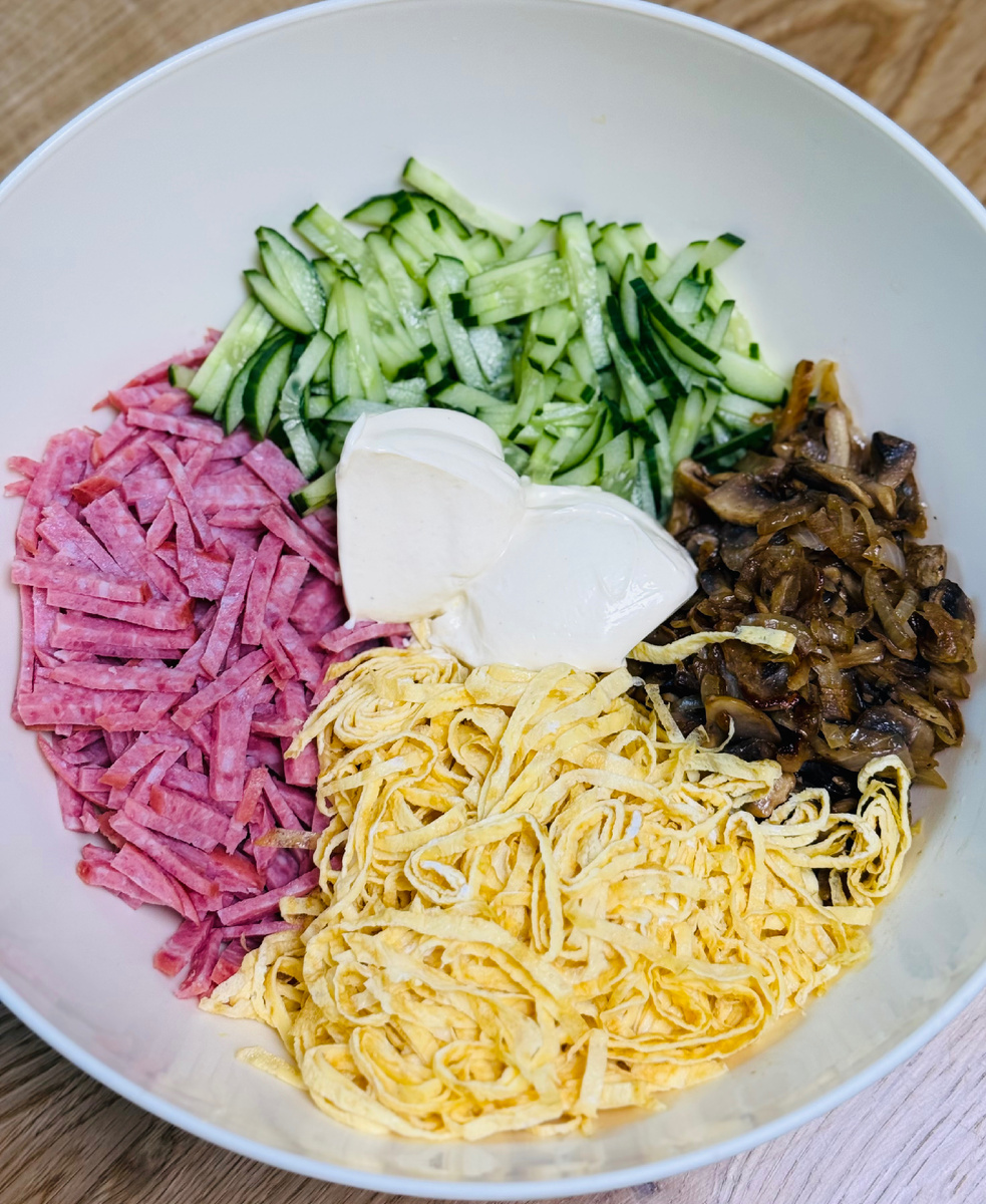 Ингредиенты: Для начала приготовим яичные блины : взбиваем 5 яиц , добавляем соль по вкусу и обжариваем как обычные блины с двух сторон . Готовые блины сворачиваем в рулет и нарезаем тонкой соломкой . Шампиньоны и лук нарезаем соломкой и обжариваем до золотистого цвета. Колбасу и свежий огурец нарезаем тоже соломкой . Заправляем наш салат майонезом и хорошенько всё перемешиваем . Всем приятного аппетита 😋