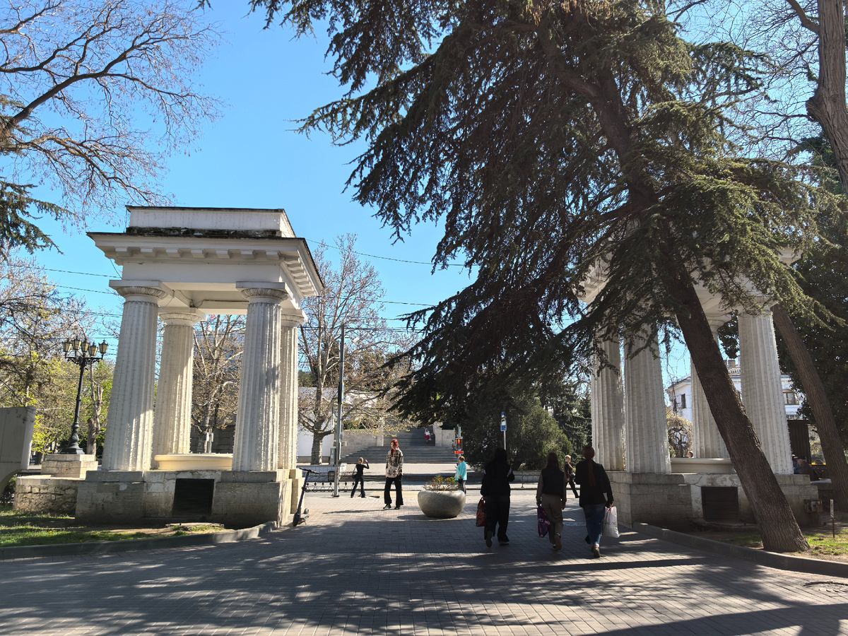 В этой статье погуляем по Матросскому бульвару, посмотрим на цветущие тюльпаны и деревья. Ну что, пойдём прогуляемся? Статья написана автором канала на Дзен «Прогулки по Севастополю». Копирование и использование материалов из статьи без согласования с автором запрещены. Мы с вами уже погуляли по Приморскому бульвару, посмотрели там парад тюльпанов (если пропустили, то ссылка на статью будет в конце). А теперь перейдём дорогу и поднимемся на Матросский бульвар: Перешли дорогу: Но сразу по ступенькам мы не будем подниматься, потому что я нашла рядом ещё тюльпаны. Справа от лестницы есть доска с фамилиями почётных граждан Севастополя: А напротив нёё установлен памятник Сенявину: Рядом с ним высадили много тюльпанов: Видно, что не все тюльпаны ещё начали цвести: Тюльпаны здесь посажены такие же как и на Приморском бульваре, поэтому их я не буду подробно показывать. А дальше поднимаемся по лестнице: Интересно посадили цветы, в виде Андреевского флага: Андреевский флаг — кормовой флаг