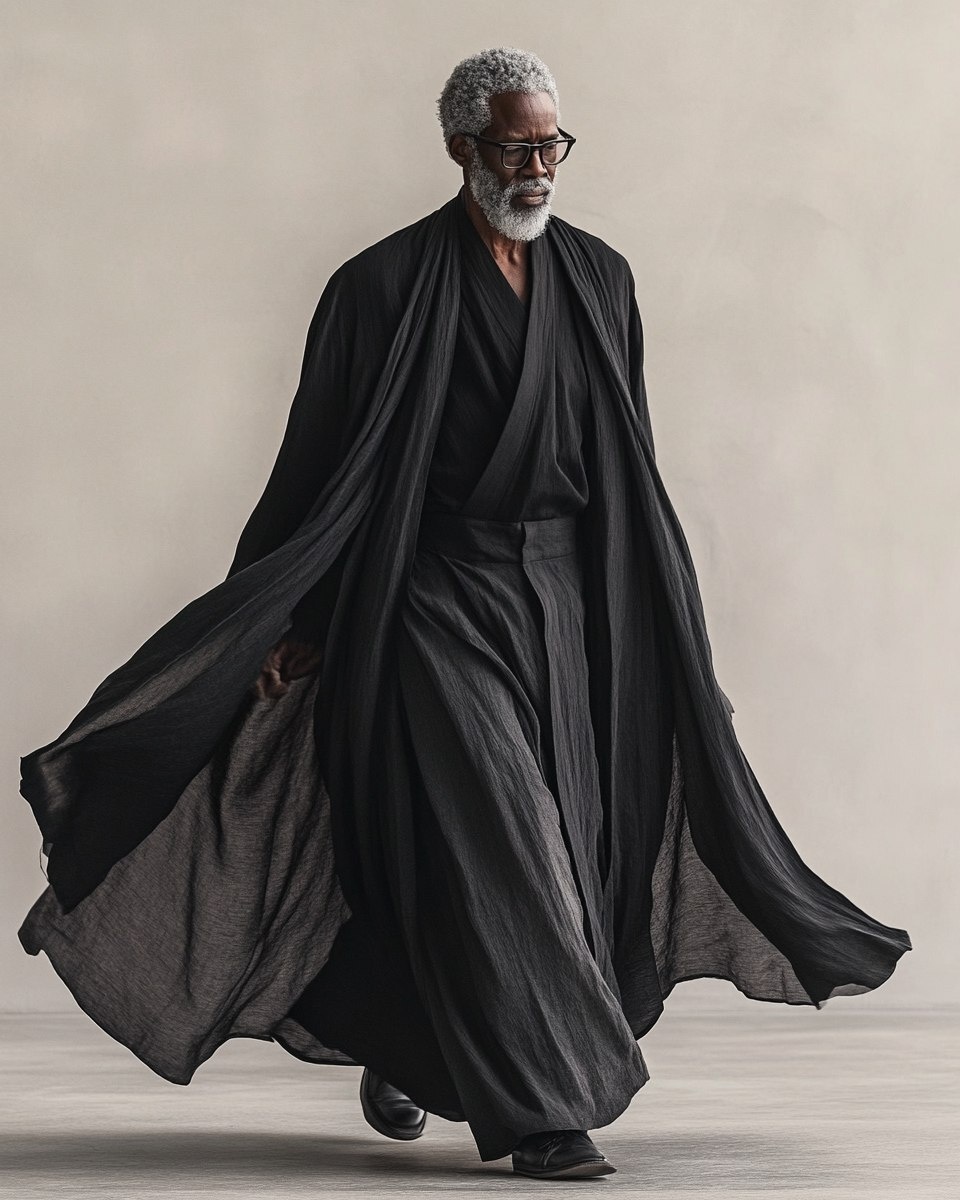 Создано на основе запроса: A full-body photograph of an elderly Black man with gray hair and a beard, wearing glasses and walking on a runway in a long, flowing robe designed in the style of Rick Owens. The fashion photography has a minimal background and is hyper-realistic and cinematic in style. --- Автоперевод: Фотография всего тела пожилого черного мужчину с седыми волосами и бородой, одетая в очки и ходьба на взлетно-посадочной полосе в длинной, плавной мантии, спроектированной в стиле Рика Оуэнса. Как тебе эта картинка? 🤔 https://dzen.ru/id/65c0c65c86e4f837c27b24d7 #ИИ #AI #нейросеть #midjourney #art