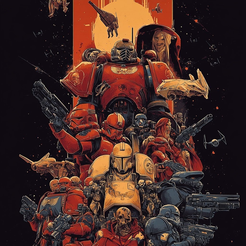 Создано на основе запроса: A warhammer 40K poster filled with space marines in the style of the Star Wars Force Awakens poster