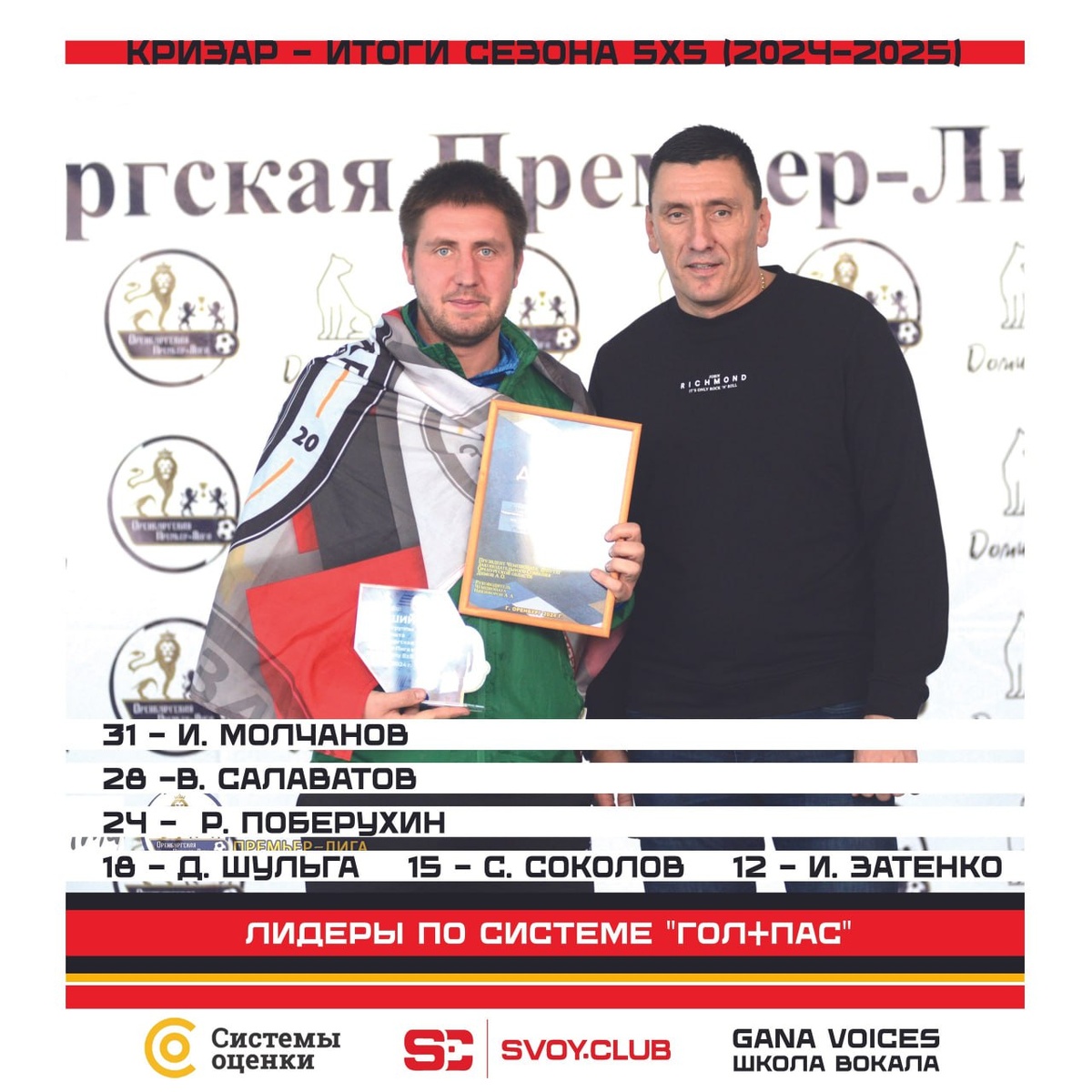 ❤️🖤 ИТОГИ СЕЗОНА 2024-2025 В ФОРМАТЕ 5Х5. ЛИДЕРЫ КРИЗАРА ПО СИСТЕМЕ ГОЛ+ПАС. Тройка Молчанов-Салаватов-Поберухин оформила 83 результативных действия. Вторая по результативности тройка футболистов сделала 45 результативных действий. В сумме указанные шесть футболистов оформили 128 результативных действий, что составило чуть более 72 % всех результативных действий команды. Делаем вывод, что связка Молчанов-Салаватов-Поберухин-Шульга_Соколов-Затенко была наиболее эффективной ! При поддержке: SVOY.CLUB GANA VOICES - школа вокала Системы оценки Оренбургский драматический театр им. М. Горького Оренбургская областная библиотека им. Крупской Уютный гипс #fckrizar #мывоинывсейземли #дапребудетснамисила #WeAreKrizar #SvoyClub