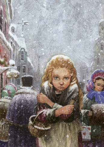 Девочка вышла из дома в туфлях, которые когда-то носила ее мама. Но так получилось, что один башмак девочка потеряла по дороге, а другой как-то смог стащить проворный мальчишка. И вот теперь девочке приходилось идти босиком, и ее ножки совсем уже замерзли и посинели от холода.