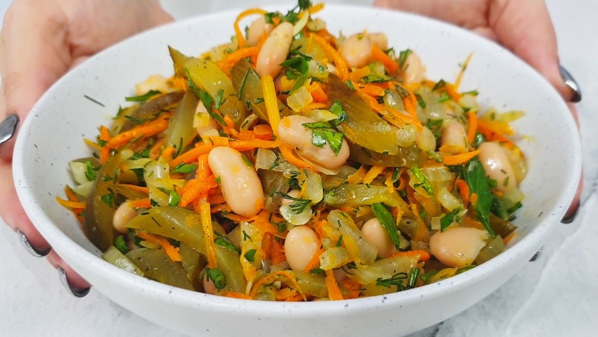 Когда лень готовить что-то сложное, а хочется чего-то сытного и простого, желательно без долгих танцев у плиты, но чтоб вкусно, сочно и не банально — этот салат точно не для вас. Минимум ингредиентов, максимум вкуса. Он и закуска, и лёгкий ужин, и отличный гарнир — универсальный салат на каждый день. Готовится буквально за 10–15 минут, а съедается ещё быстрее. Понадобится всего ничего: пара овощей, банка фасоли, немного зелени — и солёные огурцы, которые придают всей тарелке ту самую пикантность и характер. Готовится элементарно, но вкус — как будто долго думали, подбирали, что с чем сочетается. А на деле — просто, доступно и бюджетно. Как готовим: Огурцы нарезаем тонкой соломкой и отжимаем лишнюю жидкость — это важно! Иначе салат потечёт и будет водянистым. Перекладываем в миску. Лук режем полукольцами, морковь — на крупной тёрке. Обжариваем их на сковороде с маслом до мягкости. Лук кладем на сковородку первым и жарим пару минут до прозрачности. Потом уже добавляем морковь. Не забывае