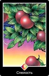 СПЕЛОСТЬ – младший аркан Радуга: владение физическим Если Ваша медитация принесла Вам свет, который не меркнет даже ночью, то даже смерть будет не смертью, а дверью в божественное. С этим светом в Вашем сердце сама смерть превратится в дверь, и Вы войдете в душу вселенной, Вы станете едиными с океаном. А пока Вы не познали этого океанического опыта, Вы живете напрасно. Сейчас – всегда тот самый момент, и плод всегда зрел. Вам только нужно собраться с духом, чтобы вступить в свой внутренний лес. Плод всегда зрел, и этот момент – всегда правильный момент. Не бывает неправильного момента. Когда плод созревает, он сам падает с дерева. В какой-то момент он висит на стебельке, наполненный соком. В следующий момент он падает – не потому, что его заставляют упасть или он сделал попытку прыгнуть, а потому, что дерево осознало его спелость и просто отпустило его. Когда в раскладе появляется эта карта, то это показывает, что Вы готовы поделиться своим внутренним богатством, своим "соком". Все