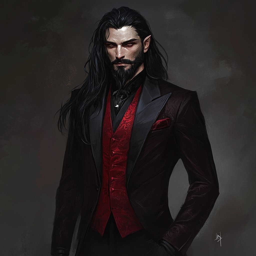 Создано на основе запроса: DnD male vampire, aristocratic, politic, red black suit, long black hair and fine beard