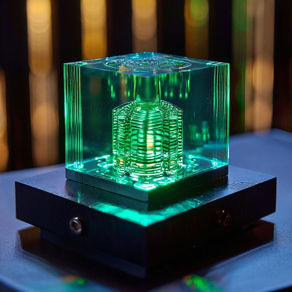 В статье показано, как в микрорезонаторах из нитрида кремния удалось сгенерировать зелёный свет с помощью фотоиндуцированных нелинейных эффектов второго порядка. Мощность зелёного света достигла 3,5 мВт, а его частота может быть изменена в широком диапазоне. Также описан метод оптического управления без использования усилителей, что позволяет гибко настраивать генерацию зелёного света.