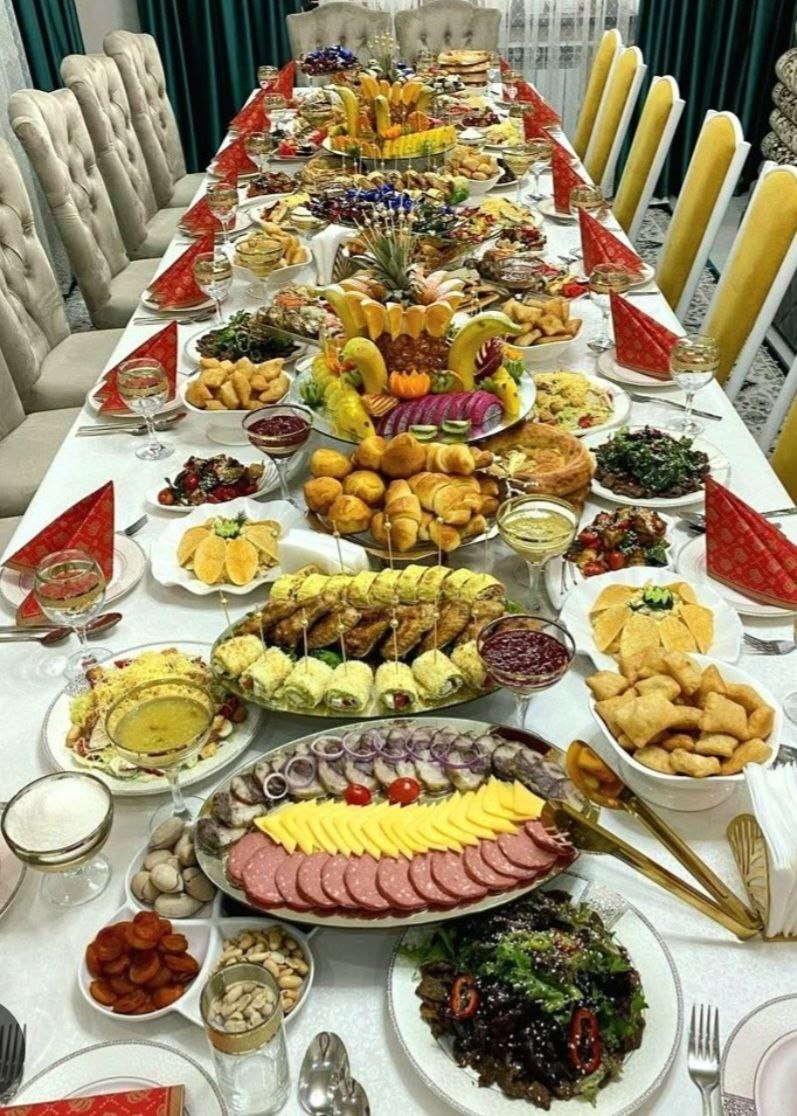 Мы прошли в комнату и обомлели: вот это банкет! Три стола были сдвинуты вместе, занимали почти всё свободное место в комнате и просто ломились от разных блюд. Чего только там не было, запах стоял такой, что все гости, обгоняя друг друга, прямиком двинулись к умывальнику мыть руки.