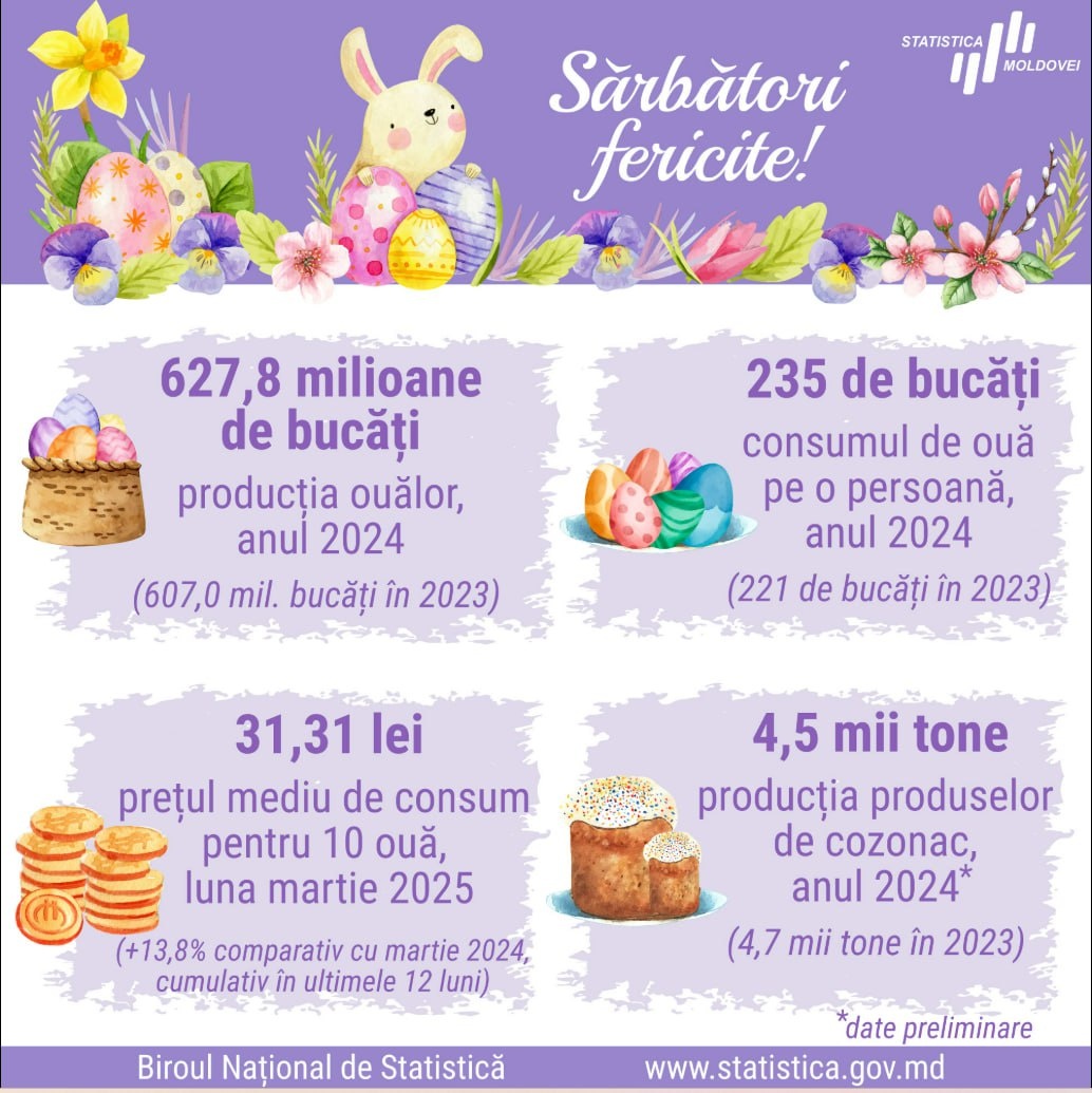 Производство яиц в Молдове за 2024 год составило 627,8 миллиона штук, увеличившись по сравнению с предыдущим годом, когда было произведено 607 миллионов яиц. Об этом сообщается в инфографике, опубликованной Национальным бюро статистики (НБС) по случаю Пасхи.