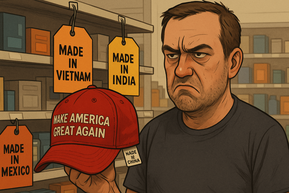 Из рубрики «Нам пишут!» В описании к моему каналу указан адрес электронной почты, на который иногда приходят весьма занимательные письма. Сегодня я снова решил поделиться одним из них. И, конечно же, с согласия автора письма и сохраняя его оригинальный текст. Привет, брат! Ты там спрашивал, как у нас тут с американским производством. Отвечаю: никак. Всё, чем гордятся местные, давно шьют, собирают и паяют где угодно, кроме, собственно, Америки. «Made in USA» — это теперь как единорог. Вроде все слышали, но никто не видел. Вот тебе мой сегодняшний день. Утро. Хочу купить себе кофеварку, старая сдохла после встречи с коркой от пиццы. Иду в магазин бытовой техники — выбор огромный, бренды все американские, логотипы с флагами, орлы, звёзды. Но поворачиваешь коробку — всё, подчистую: Китай, Тайвань, Вьетнам. Америка, говоришь? Только в логотипе. Делают они эти кофеварки явно не в Пенсильвании. Ладно. Иду дальше. Рядом магазин одежды, скидки. Думаю — прикуплю себе джинсы, раз уж все вокруг т