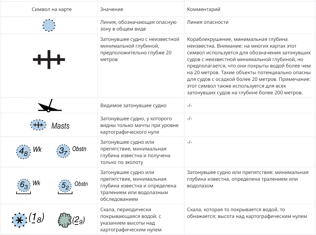 Символы карты. Кораблекрушения, опасности, глубины и скалы. База