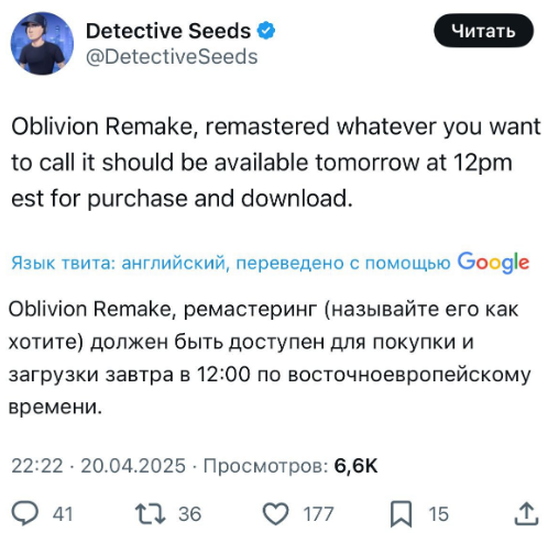 Слухи о секретной разработке и тихом запуске The Elder Scrolls IV: Oblivion ходят уже несколько месяцев, но за последние недели их стало настолько много, что многие с уверенностью говорят о грядущем шэдоу-дропе игры (одновременный анонс и релиз). Так, один из таких инсайдеров под ником Detective Seeds предоставил информацию о точном времени релиза игры. По его словам, игру анонсируют и выпустят сразу на все цифровые площадки (Steam, PlayStation Store, Xbox Store) уже сегодня в 19:00 по московскому времени. Данный инсайдер ранее сливал информацию, которая в будущем подтверждалась, а сейчас он опирается на техподдержку Xbox и инсайды из самой Bethesda.