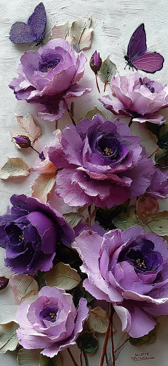 Создано на основе запроса: 3D purple roses and a butterfly with glitter on its wings, 20 rose flowers in front of the wall art painting, a