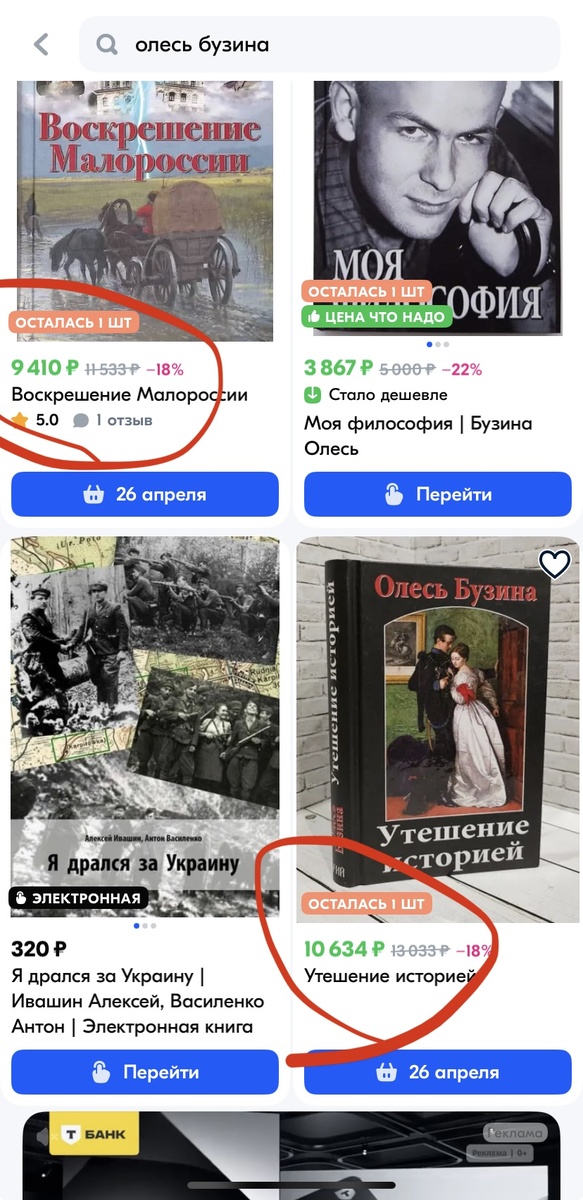 Я сегодня посмотрела (в записи, конечно) репортаж Дмитрия Киселева про Олеся Бузину, приуроченный к скорбному юбилею - 10-летию со дня убийства Бузины нацистами в Киеве. Киселев в своем репортаже несколько раз подчеркивает: Бузина - талантливый публицист, яркий писатель. В своих книгах он разоблачал антипроект «Украина». Всё так. Всё так. И у меня как у вдумчивого зрителя после просмотра репортажа возникло естественное желание прочесть книги Олеся Бузины. Потому что я знакома с его творчеством исключительно по опубликованным в Сети отрывкам. Мне кажется, что такое желание - изучить книжное наследие Бузины - возникло не только у меня. Но вот вопрос: где же это у нас купить в свободном доступе? Я поискала книги Бузины в приложениях «Лабиринта» и «Читай-Города». В «Лабиринте» по запросу «Олесь Бузина» вообще не появляется ни одной книги этого автора. Вместо Бузины мне предлагают купить раскраски. В «Читай-Городе» - очень много книг авторства Олеся, но всех их нет в наличии. На «Озоне» я н