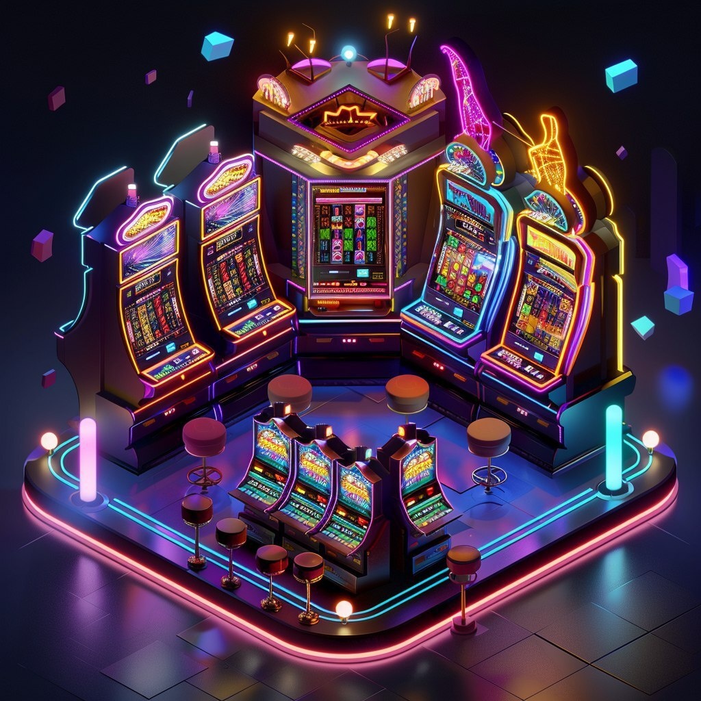 Создано на основе запроса: Macau casino interior, 3D isometric view, 45-degree angle, prominently featuring a cluster of 6 slot machines