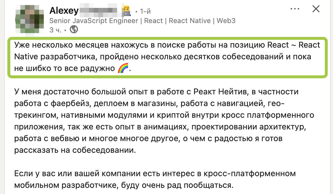 А теперь люди, опытные, не могут найти месяцами работу на мобильного разработчика в популярном стеке... Вон на картинке, почитайте.