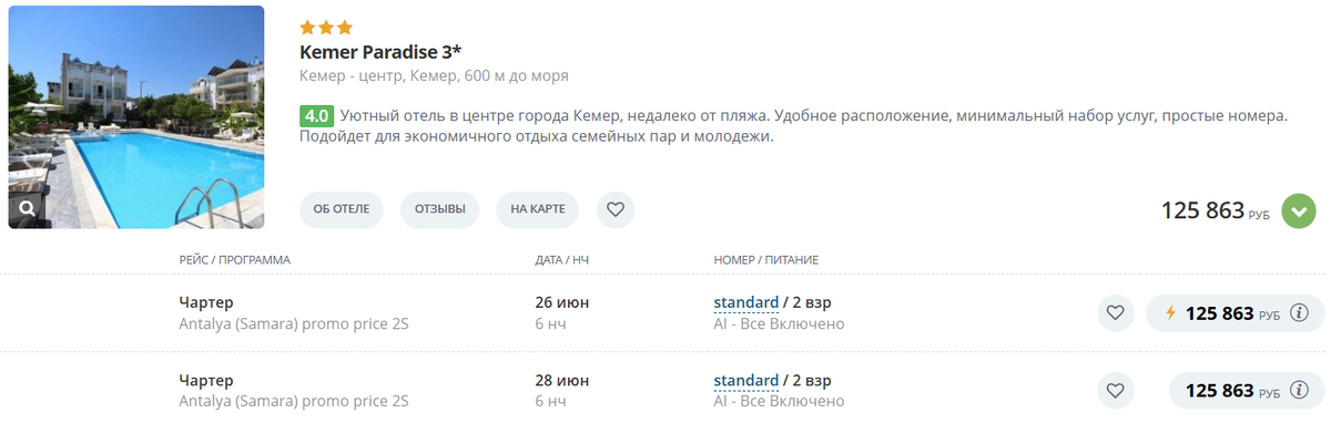 Вот цены туров в отель «Kemer Paradise 3*» с авиаперелетом из Самары в конце июня на 6 ночей для двух взрослых.