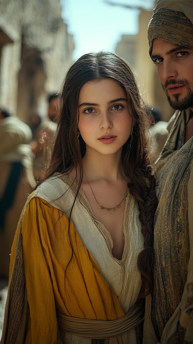 Создано на основе запроса: A young Jewish girl named Esther, wearing traditional biblical clothing, standing in a Persian city, looking