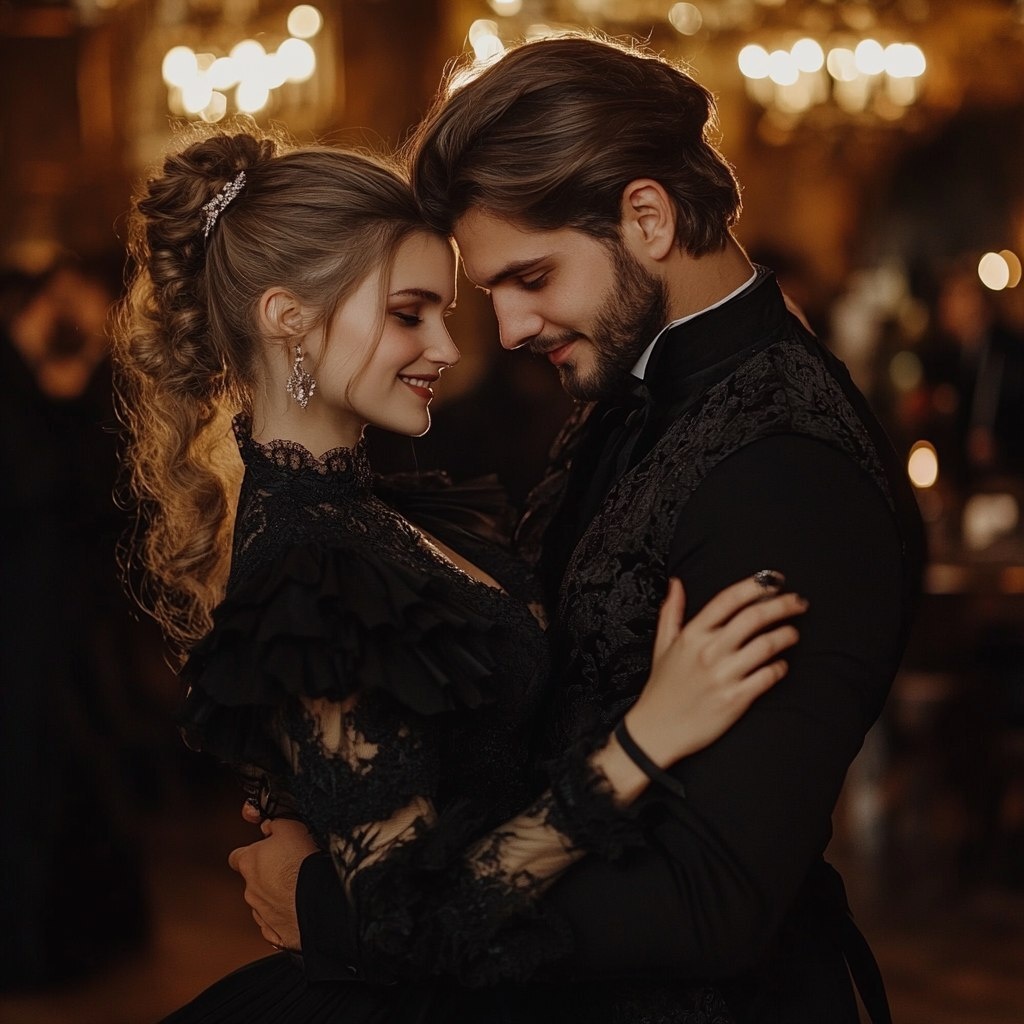 Создано на основе запроса: the girl meets her husband in the manor and they share a cute look, everyone is still dancing a valse and wearing