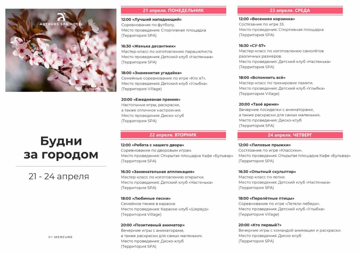 🌞 Весна в разгаре, а у нас — солнце, смех и отдых без забот! С 21 по 24 апреля приглашаем вас провести будни ярко, активно и с хорошим настроением! 💛 🏃♂️ Активный отдых на свежем воздухе — «Лучший нападающий» (21.04, 12:00) — заряд бодрости на футбольной площадке — «Ребята с нашего двора» (22.04, 12:00) — дворовые игры, как в детстве — «Весенняя корзинка» (23.04, 12:00) и «Лиловые прыжки» (24.04, 12:00) — весёлые соревнования под солнцем 🎨 Творческие мастер-классы для детей — «Женька десантник» (21.04) и «СУ-57» (23.04) — мастерим летающую технику — «Опытный скульптор» (24.04) — лепим шедевры своими руками 🎤 Вечерние развлечения для всей семьи — Караоке «Любимые песни» (22.04, 18:00) — поём всей душой — Каждый вечер в 20:00 — уютные посиделки, раскраски, игры и море позитива 🌼 Отдыхайте с удовольствием, гуляйте под тёплым солнцем и наполняйтесь весной вместе с нами! Бронирование номеров по телефону: +7 (495) 150-41-21 (Ресепшн / Отдел бронирования / WhatsApp)