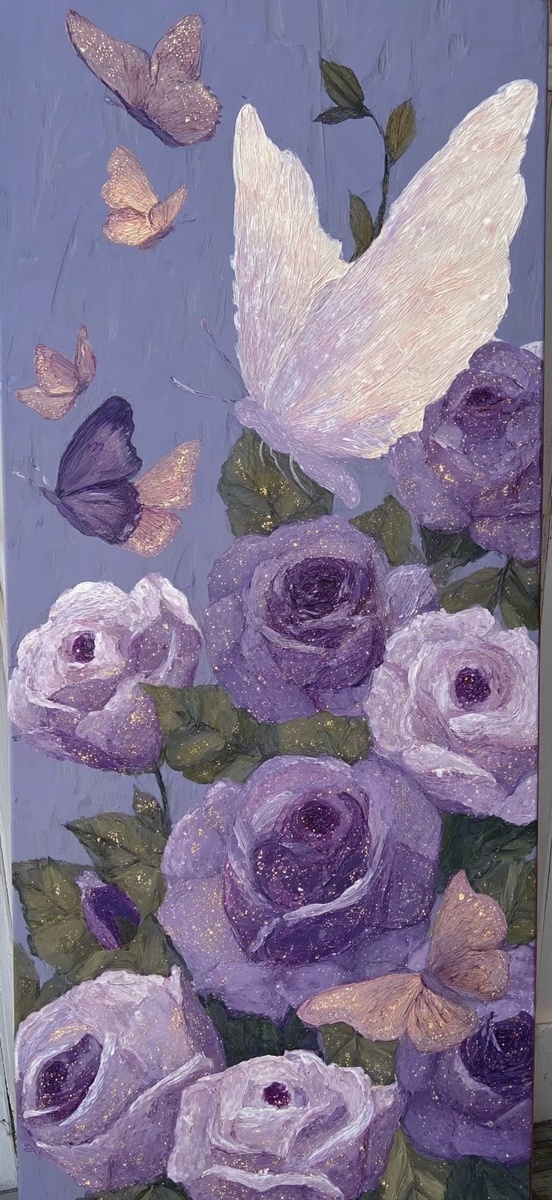 Создано на основе запроса: purple roses and butterflies, with glitter on the wings of a large fairy in lavender, centered on a canvas