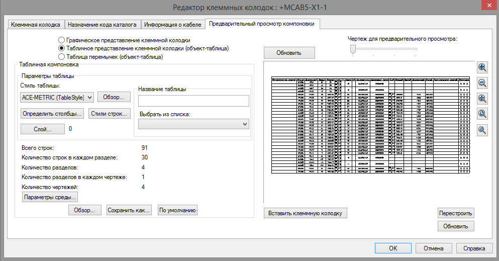 Выбранные параметры сохраняются в табличном представлении клеммника на чертеже, и при последующем редактировании клеммной колодки выполняется считывание этих параметров.