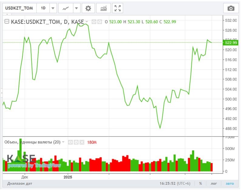 Обзор рынков подготовили аналитики Ассоциации финансистов Казахстана (АФК). По итогам пятничных торгов курс USD/KZT снизился на 1,05 тенге, до уровня 522,1 тенге за доллар. Укреплению нацвалюты способствовала совокупность внешних и внутренних факторов. С одной стороны, благоприятная внешняя конъюнктура – рост цен на нефть, укрепление российского рубля и восстановление глобального аппетита к риску – создала условия для усиления позиций тенге. С другой стороны, поддержку тенге оказали и внутренние условия, в том числе стабильное предложение валютной ликвидности со стороны Нацбанка, субъектов КГС и экспортёров. Дополнительным фактором стал частично удовлетворённый спрос на инвалюту со стороны отдельных участников рынка. Диаграмма 1. Курс по паре USD/KZT: Источник: KASE Индикативные ставки денежного рынка повысились на фоне увеличения спроса на краткосрочную ликвидность со стороны отдельных участников и волатильности валютного рынка. Так, доходность TONIA выросла с 15,51% до 15,63%, в то в