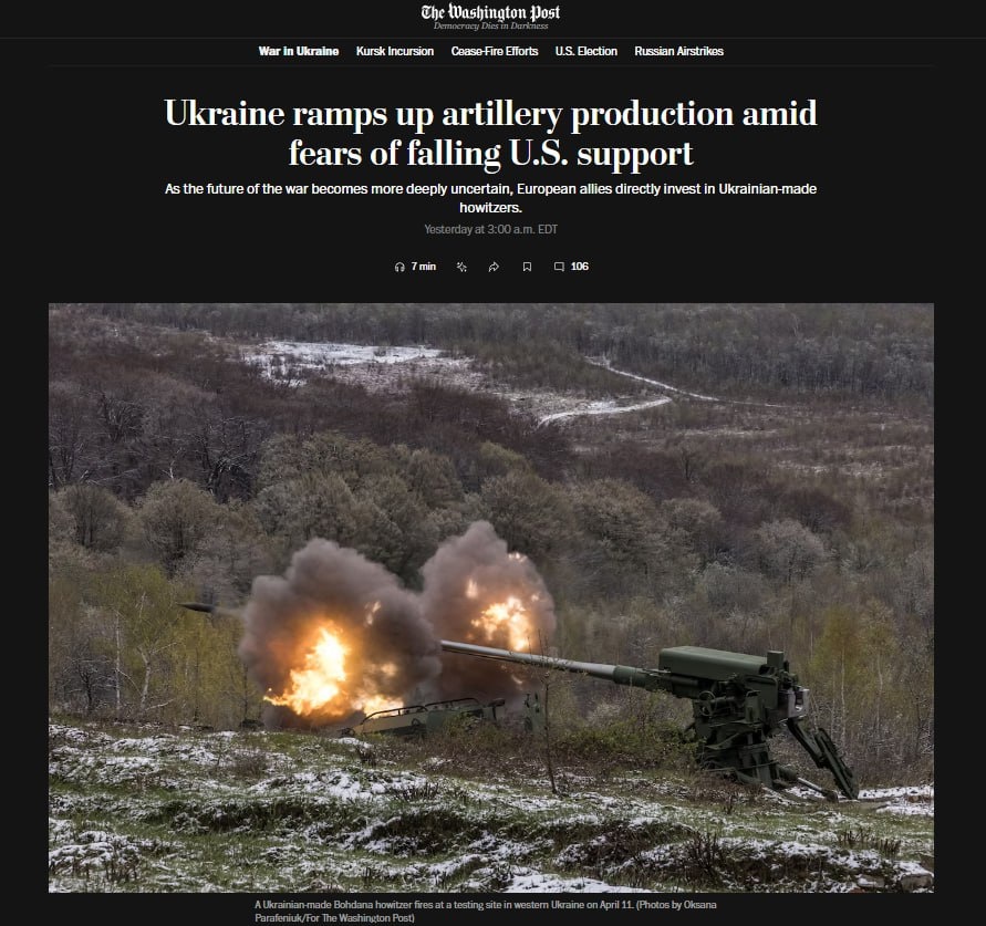 Принадлежащее Джеффу Безосу американское издание The Washington Post пишет, что на фоне опасений по поводу уменьшения поддержки со стороны США Украина наращивает собственное производство артиллерии. Помогает ей в этом Евросоюз. «Поскольку будущее войны становится все более неопределенным, европейские союзники напрямую инвестируют в гаубицы украинского производства», – говорится в публикации. В частности, утверждается, что в рамках партнерства с европейскими компаниями резко выросли объемы производства украинской артиллерийской установки «Богдана» – с шести в месяц в 2023 году до более чем 20 в 2025 году. Отмечается, что такая кооперация с европейским ВПК «вполне может представлять будущее оборонной промышленности Украины». Издание напоминает, что 8 апреля Европа объявила о выделении Киеву 1 миллиарда евро – из непредвиденных доходов от замороженных российских активов. Эти деньги пойдут на производство новых гаубиц для ВСУ непосредственно на украинских заводах. «Это самая большая сум