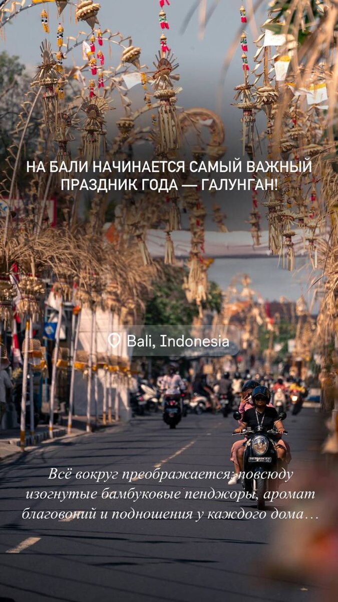 Галунган — главный праздник на Бали Уже 23 апреля на острове наступит особенное время ✨ Балийцы будут отмечать Галунган — день, когда, по их вере, духи предков возвращаются домой, а добро побеждает зло ☯️ Улицы украшают изогнутыми бамбуковыми пенджорами , в храмах звучат молитвы , а в воздухе — аромат благовоний и ощущение чего-то волшебного Если ты на Бали — не пропусти эту магию!🙏