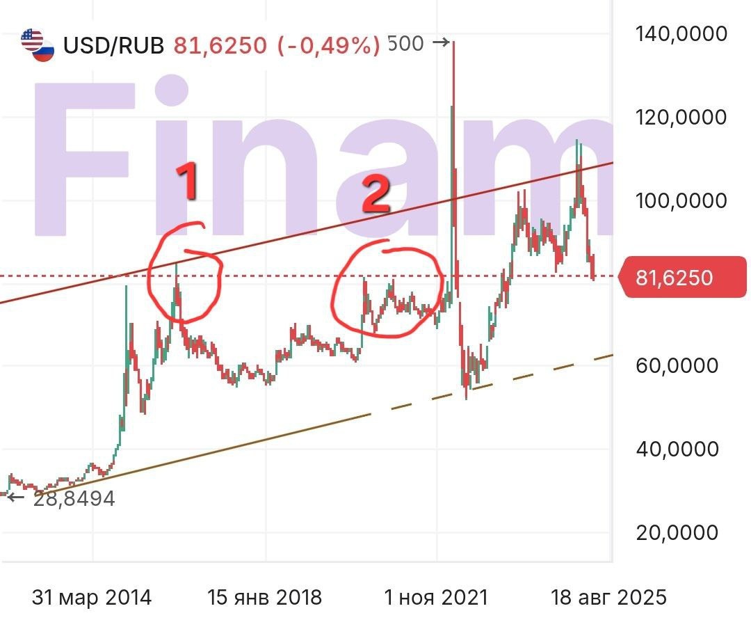 Ну, вот как-то так выглядит тренд в $/₽ на неделях. Нижняя линия восходящего канала проходит в районе 63-65₽. Но, как всегда, есть нюанс... Этот нюанс - 80₽ за $. Этот уровень много лет выступал сопротивлением. Первый раз - в Крымскую весну. Второй раз - в ковидный шухер. Уровень очень хорошо проторгован и является мощной поддержкой теперь для доллара. Этот уровень, гуляя ходом, не пройдёшь. Его все видят. И если у кого-то ещё остались шорты или PUT-опционы, многие на 80 будут их закрывать, да уже даже сейчас закрывают. Поэтому на этом уровне потолкаемся. Но за то если (когда) таки пройдём этот уровень, там уровень 65₽ может быть достигнут просто лавинообразно, в течение одной недели. ( чего очень не хотелось бы конечно ) #рубль