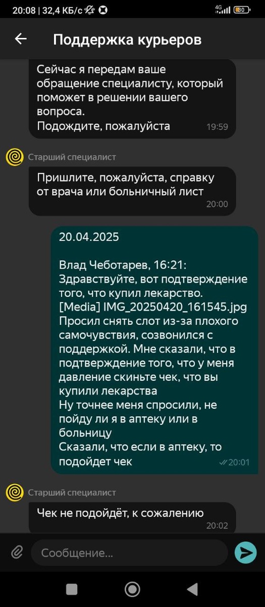 Чувствовал себя не очень, поставил на паузу и решил написать в поддержку, чтобы сняли слот без корректировки. Сказал, что из-за жары плохо себя чувствую и давление скорее всего высокое. В поддержке мне естественно не помогли. Когда пауза закончилась, то пришёл заказ. Я позвонил в поддержку, объяснил ситуацию. Мне сказали, что если вы пойдете в аптеку и купите лекарство от давления, то подойдет чек из аптеки. В итоге мне отписали, что корректировку не получается обжаловать, так как наши коллеги ошиблись и чек не является доказательством