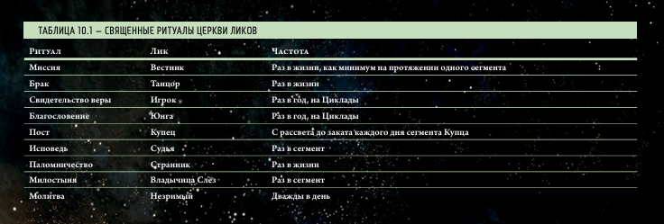 или у входа в катакомбы давно разрушенного храма. Впрочем, катакомбы, в которых хранятся кости святых, располагаются под многими действующими храмами, но чем культовое сооружение древнее, тем более обширны и глубоки его подземелья. Внутри, под присмотром священников, монахов‑воинов или самих Ликов и их святых, сокрыты реликварии, в которых хранятся особо ценные дары и приношения. На космическом корабле или станции может и не быть места для часовни, но общая молельная комната (как минимум — совмещённая с кают‑компанией) и стена Ликов на борту есть всегда. Многие верующие и не подумают взойти на корабль, на борту которого нет хотя бы уголка, посвящённого культу Ликов, хотя, стоит признать, отыскать такой корабль весьма непросто. В пятой точке Лагранжа в системе Мелик находится уникальный (по словам его основателей) Храм‑На‑Краю‑Горизонта, посетители которого могут помолиться и помедитировать в кельях, отделённых от открытого космоса только невидимой плёнкой компрессионного поля, паря в безбрежном пространстве, озарённом лишь пламенем пылающего над головой светила.