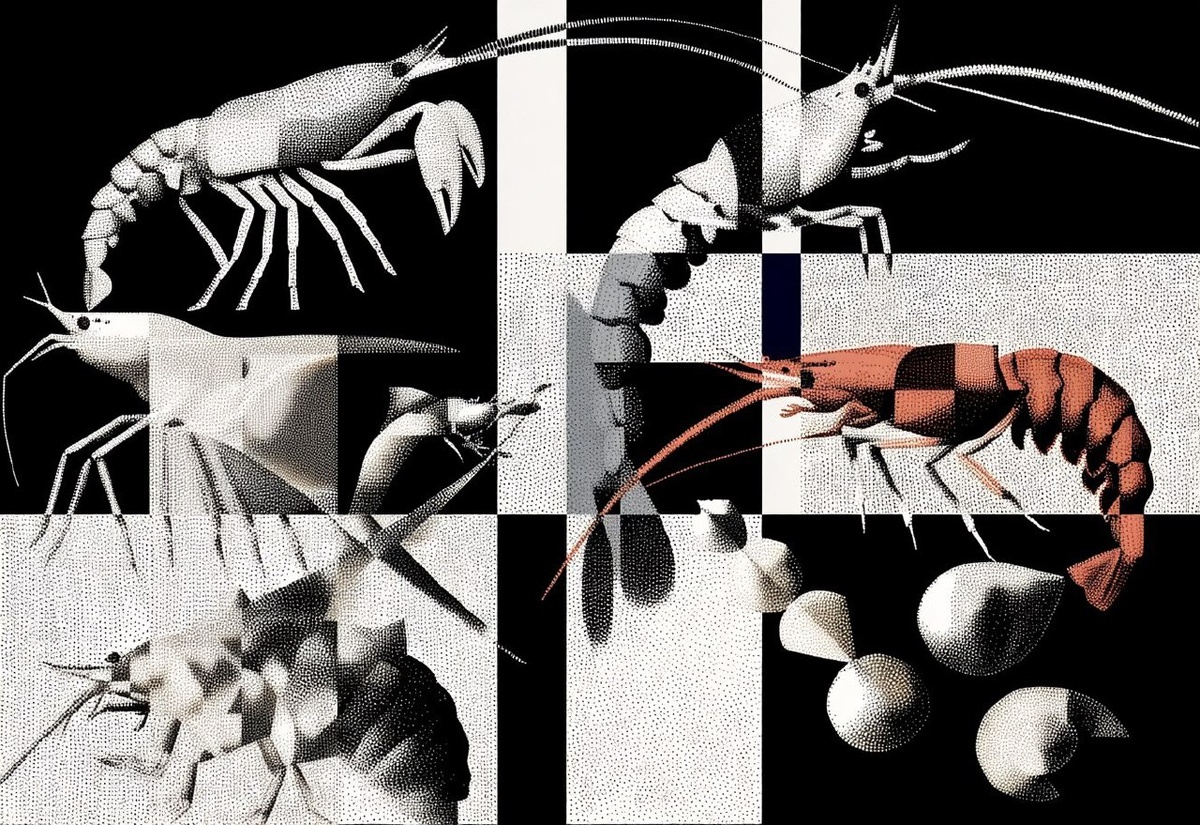 Создано на основе запроса: 'Guernica' with crustaceans: Lobsters, shrimps and crabs in the abyss, some walking in the sea floor