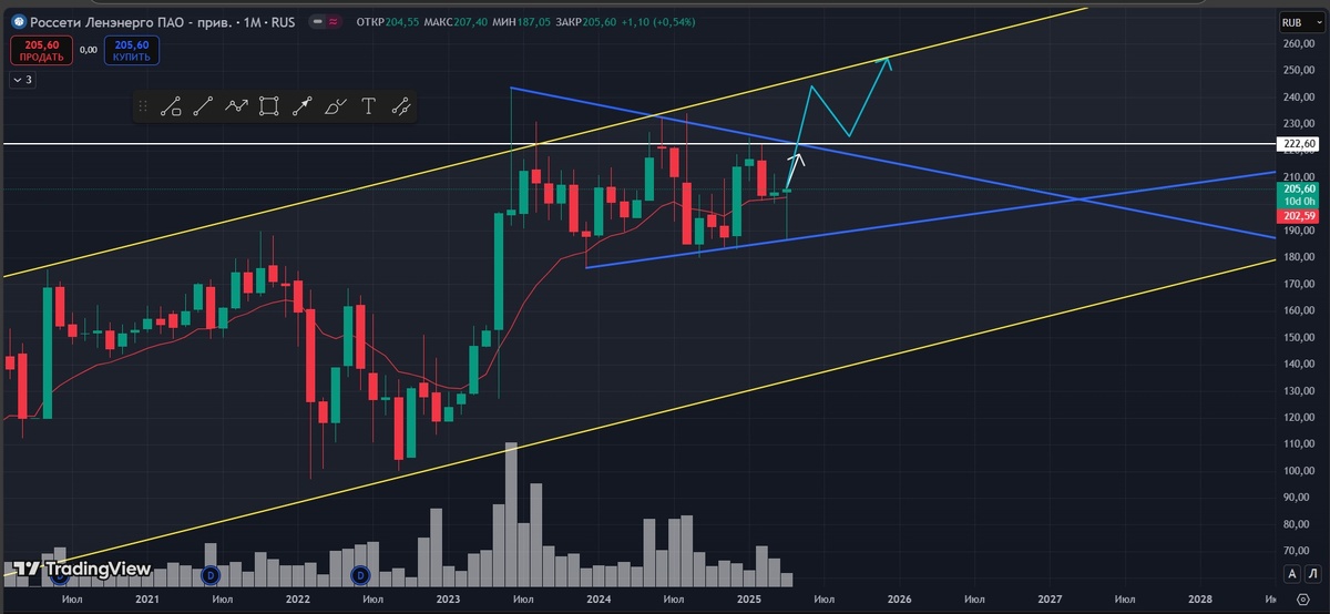 Если пробьем его, то скорее всего с ретестом пробоя можно будет добирать акцию с целями на сопротивлении желтого канала 245-250р.