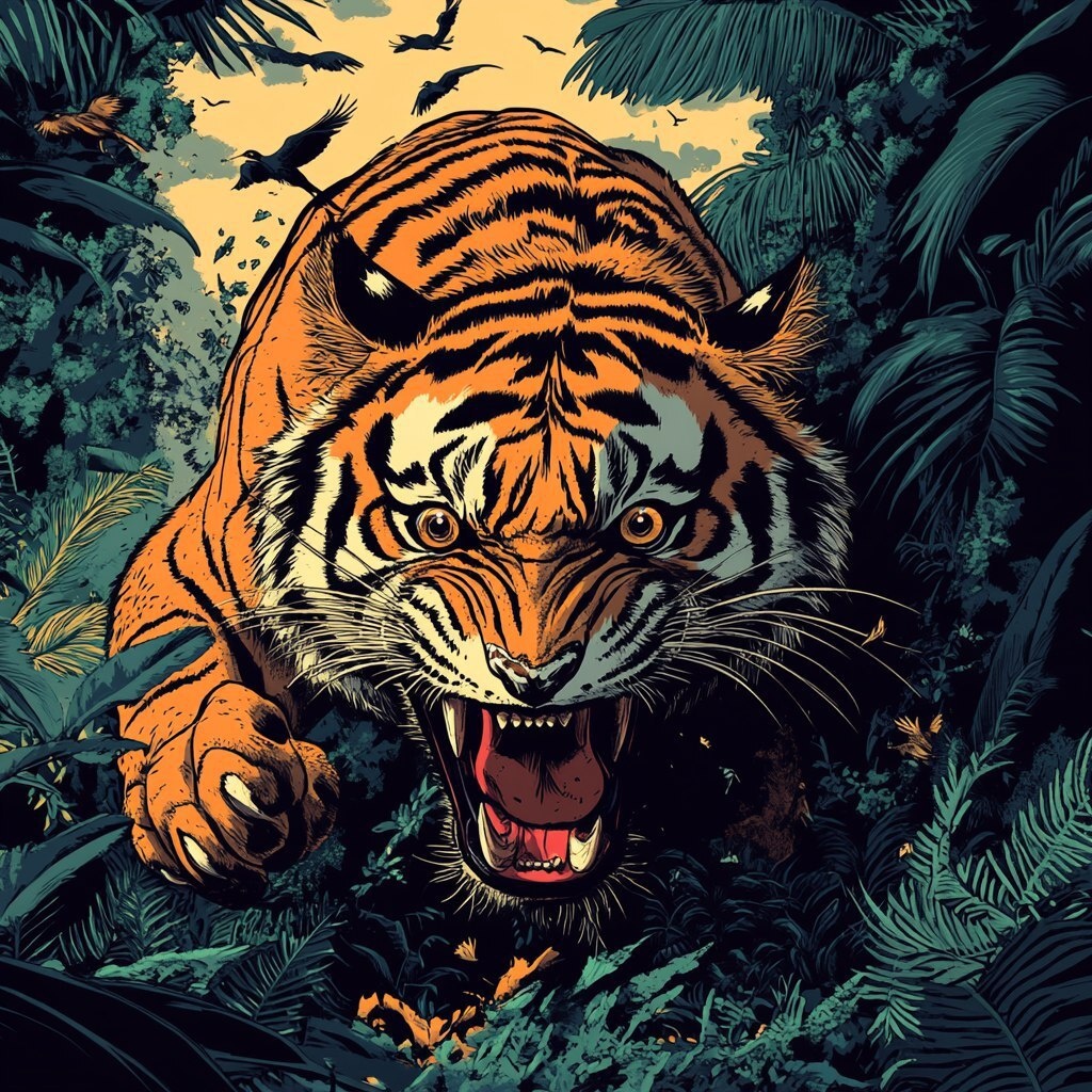 Создано на основе запроса: a tiger coming out at the scren attacking from a jungle, tropical birds flying in the background, in the style of