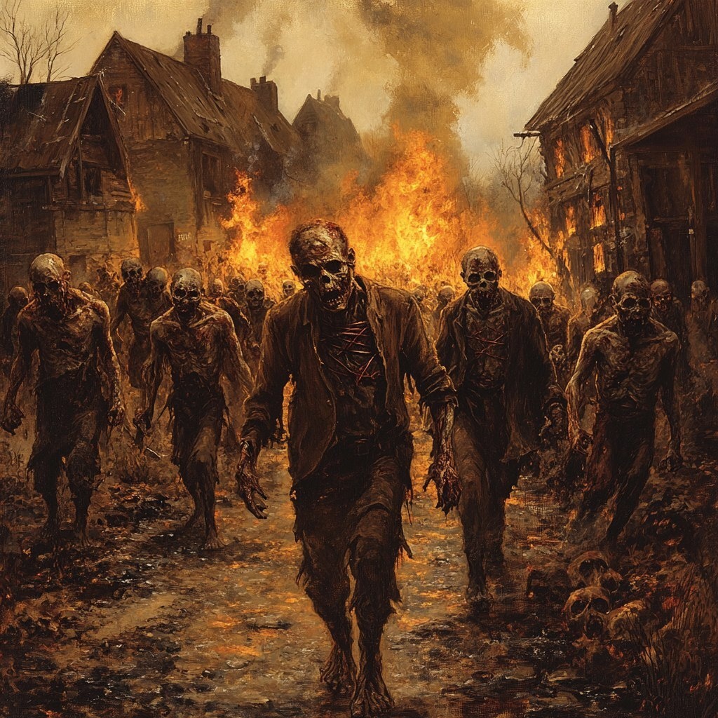 Создано на основе запроса: zombie, 1890 clotthing, some of them have stiches, walking aa lot of them in a village on fire