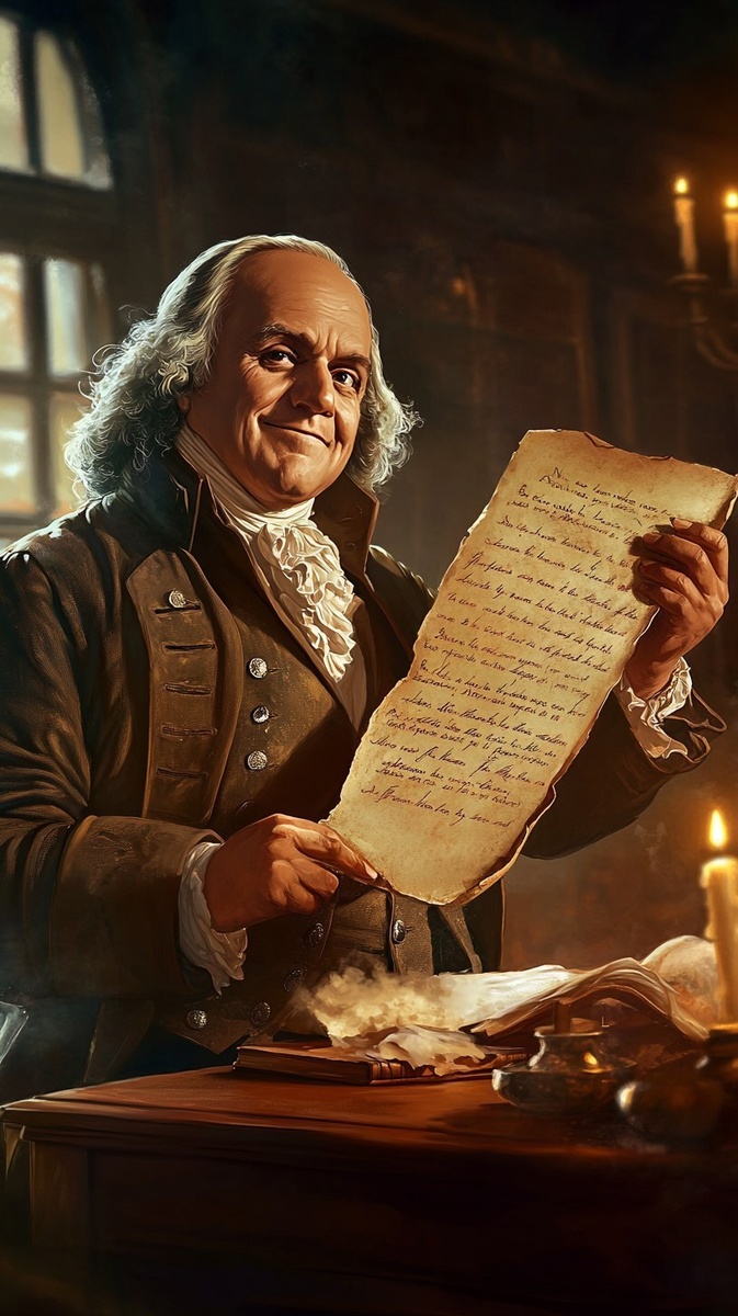 Создано на основе запроса: a historical illustration of Benjamin Franklin holding an aged scroll with an elegant handwritten title like