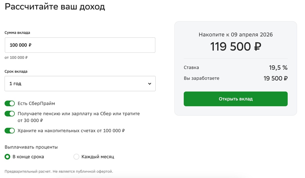 Итого я могу положить деньги под 19,5% — посчитал это на калькуляторе вкладов: