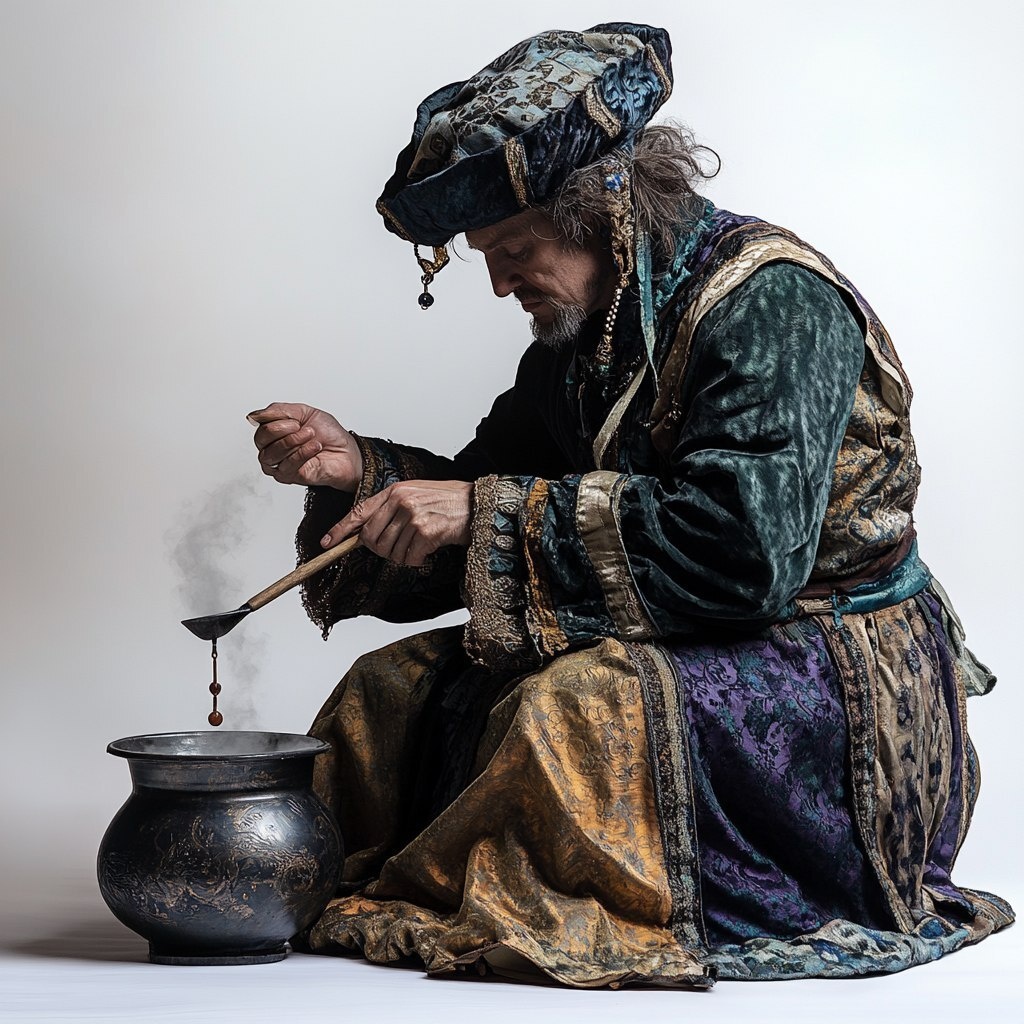 Создано на основе запроса: photo of a medieval alchemyst sitting infront of small cauldron, stirring, dressed in ornate robe and hat, side
