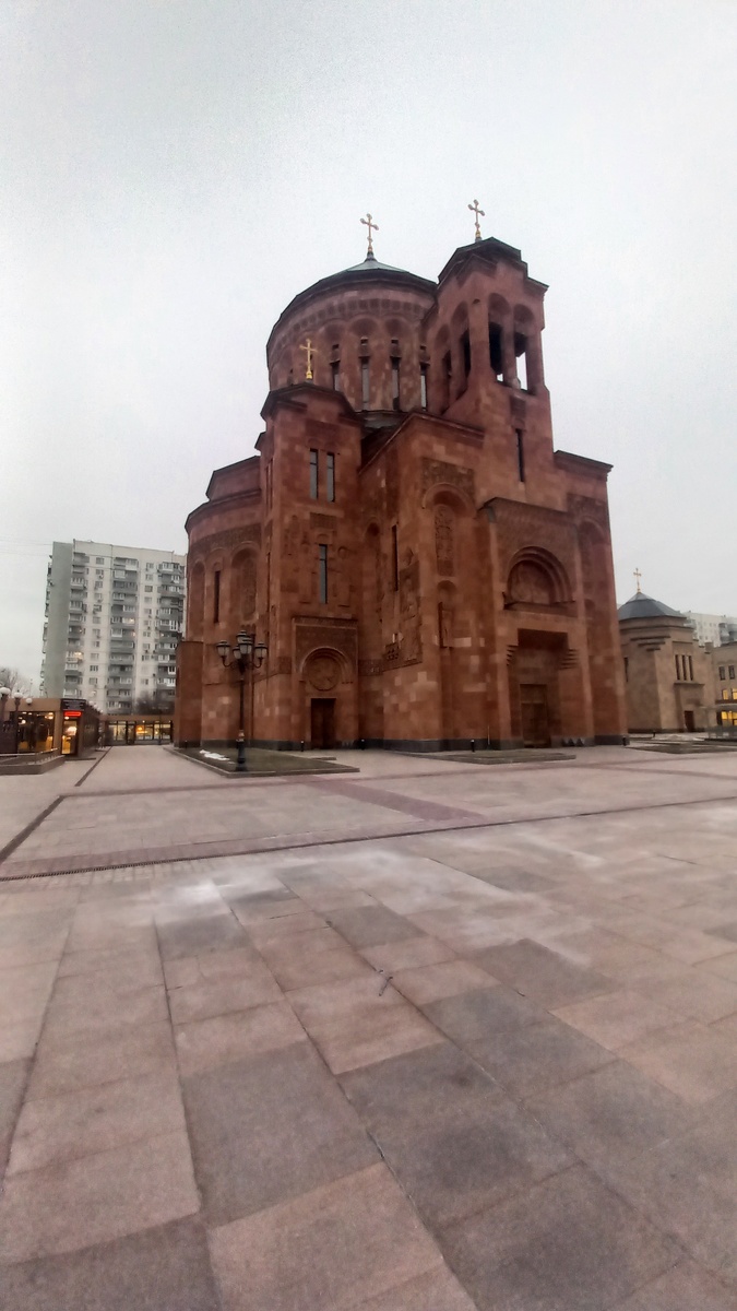 Однажды от подруги я узнала,что есть в Москве среди шумных улиц и величественных зданий тихая гавань духовности и культуры армянского народа-Кафедральный собор Преображения Господня армянской Апостольской церкви. Храм является одним из религиозных и культурных центров армянской общины. Храм поражает красотой и гармоничностью. Он был построен в 2013 году строго по армянским канонам,основанных на традициях классической армянской архитектуры.Снаружи облицован туфом разных оттенков. А изнутри выложен гранитом,травертином и мрамором. Высота без креста составляет 50 м. Храм рассчитан на 1 тыс.прихожан. Участок под строительство храма был выделен в 1996 г правительством Москвы.В 2004 г был освящен фундамент. Строительство планировали закончить в 2011 г,но оно затянулось из-за суда по поводу присвоения денег,выделенных на храм. Зайти внутрь может любой,но все же стоит помнить,что это храм,а не место праздного развлечения. Внутри царит тишина и покой. Привычных христианских икон нет,вм