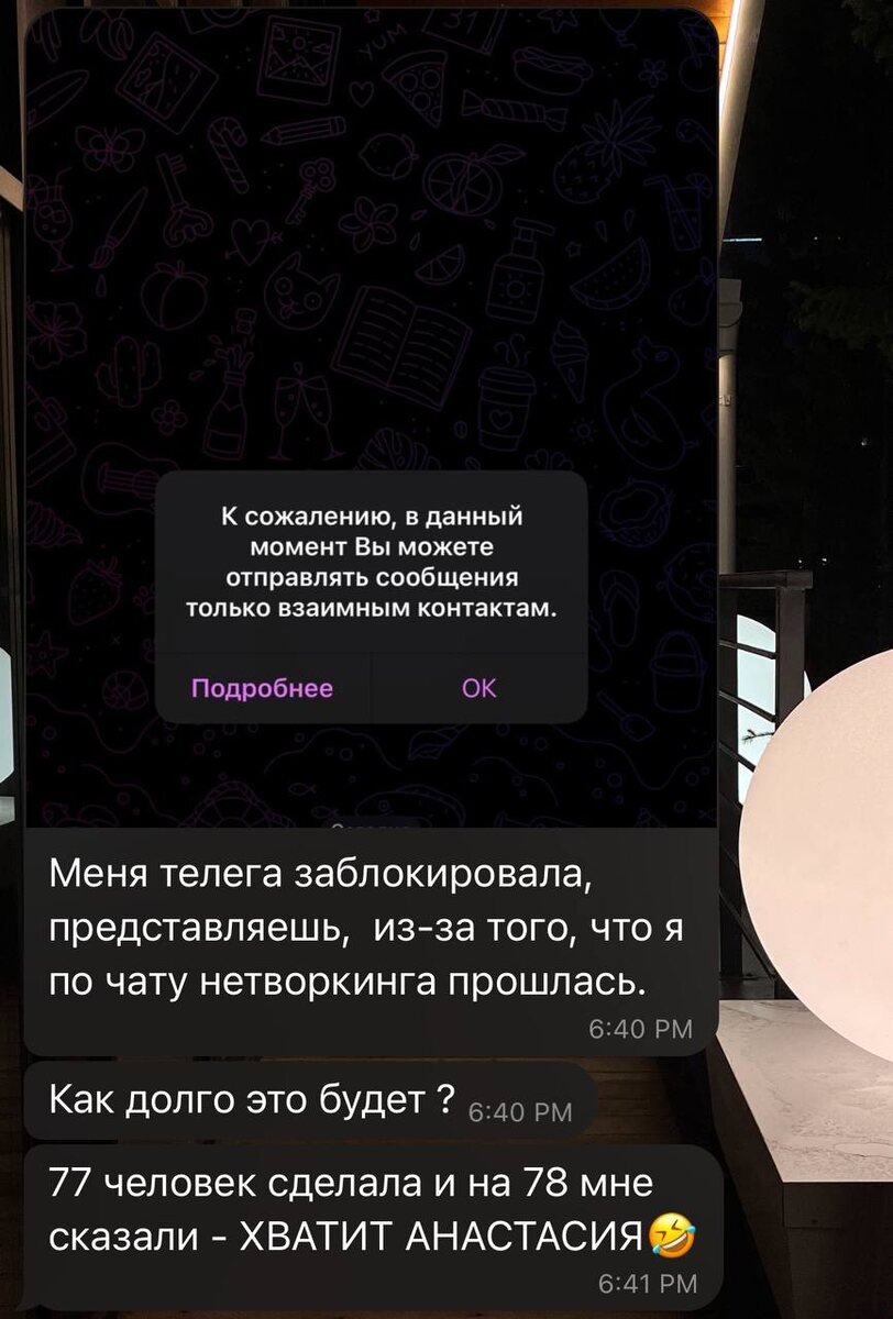 добро пожаловать в стаю: сегодня двое человек мне написали насчёт блокировки аккаунта в телеграме телеграм ужесточает контроль, и вы можете получить бан, даже если одно сообщение отправите только своим друзьям. это нужно, чтобы все жили спокойно без арабов, спама и потери аккаунтов, но многим это мешает работать я уже писал насчёт табу на рассылку. сегодня более подробно поговорим о том, как не налететь на бан и что делать, если вас часто бросают в черный список @klzhnkv